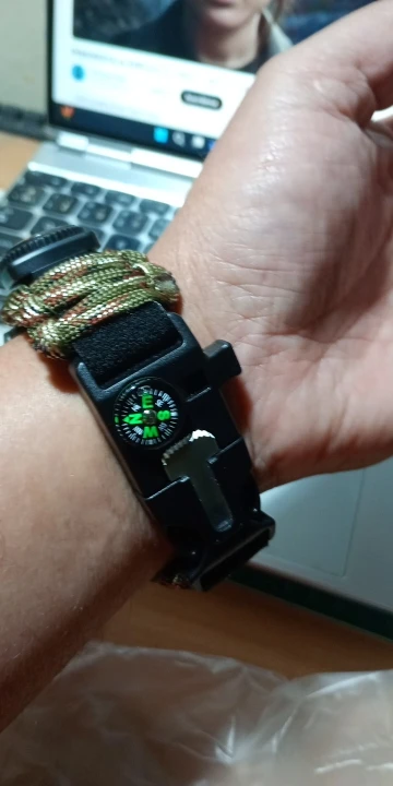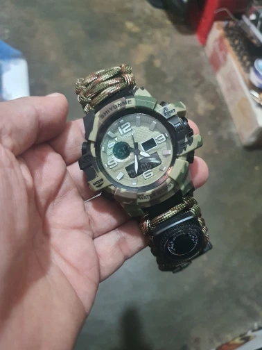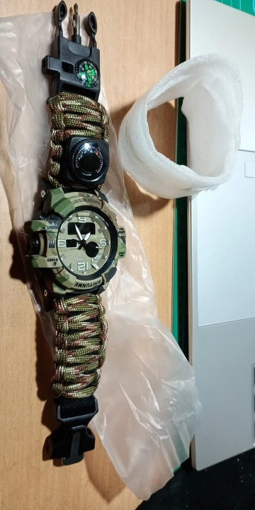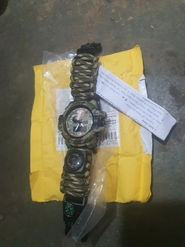 The most impressive thing about this watch are the many functions including: a compass, thermometer, whistle, screwdriver, SOS/Flashlight, card pin, T-Blade, scraper, corkscrew, sickle, hex wrench, umbrella rope, and other survival gears. Perfect choice for all kinds of outdoor sports and everyday use. Note: Flintstone defaults to screwdriver due to shipping issues